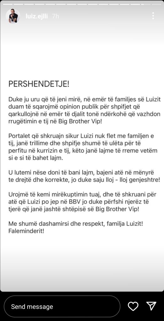 Duke ju uruar që të jeni mirë, në emër të familjes së Luizit duam të sqarome opinion publik për shpifjet që qarkullojnë në emër të djalit tonë ndërkohë që vazhdon rrugëtimin e tij në “Big Brother Vip!”