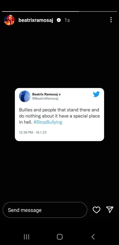 “Bullzuesit dhe njerëzit që thjesht qëndrojnë atje e nuk bëjnë asgjë për këtë, kanë një vend special në ferr”- shkruan Beatrix.