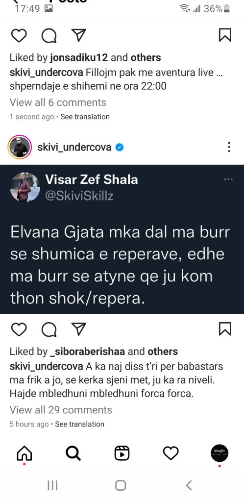 Ditën e sotme vendosi të ripostoi një status të cilin e kishte vërë ditë më parë në llogarinë e tij zyrtare “Twitter”.“Elvana Gjata mka dal ma burr se shumica e reperave, edhe ma burr se atyne qe ju kom thon shok/repera”, ishte statusi. “A ka naj diss t’ri per babastars ma frik a jo, se kerka sjeni met, ju ka ra niveli. Hajde mbledhuni mbledhuni forca forca”, shkroi krahas postimit.