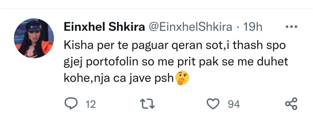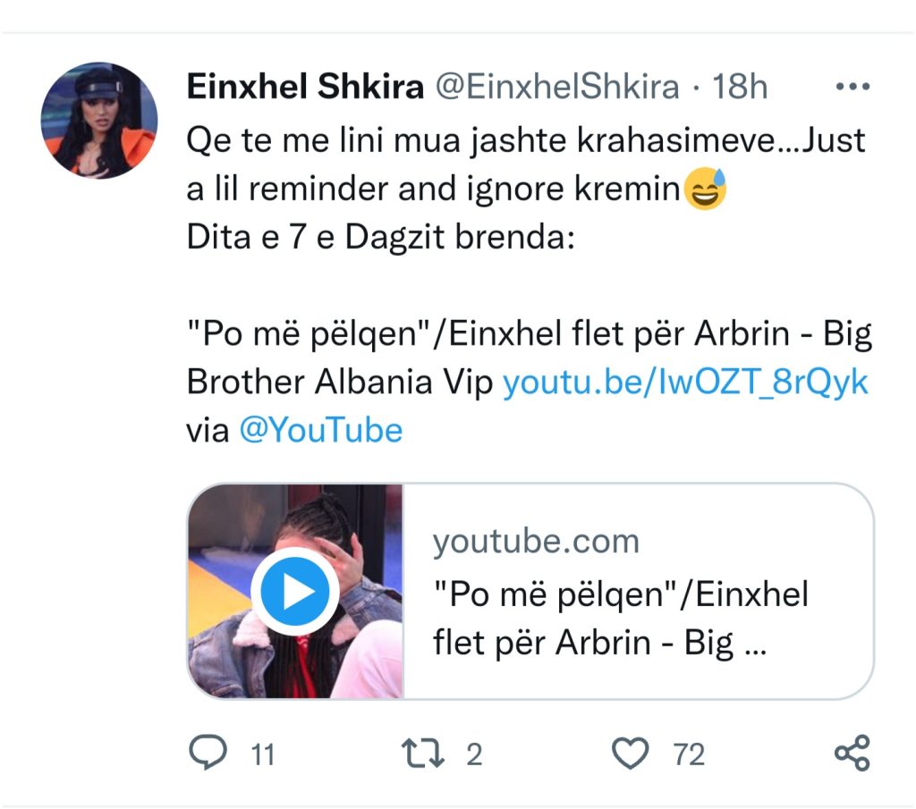 “Që të më lini mua jashtë _…Thjesht një rikujtesë e vogël: Dita e 7 e Dagzit brenda: “Po më pëlqen” – Einxhel flet për Arbrin – Big Brother Albania Vip”, shkroi ajo.