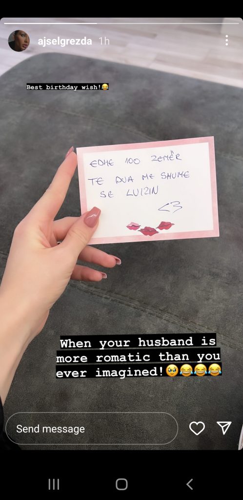 Këtë urim sigurisht që Ajsel e ndau me ndjekësit e saj ku krahas tij shkruan: “Kur burri jot është më romantik nga sa e ke imagjinuar.”