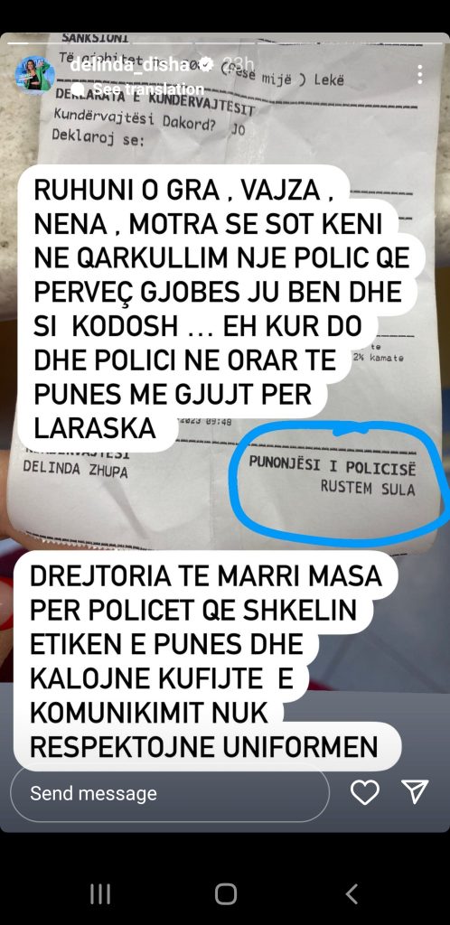 “Ruhuni o gra, vajza, nëna, motra se sot keni në qarkullim një polic që përveç gjobës ju bën dhe si kodosh…. Eh kur do dhe polici në orar të punës të gjuaj për laraska. Drejtoria të marrë masa për policët që shkelin etikën e punës dhe klaojnë kufinjtë e komunikimit, nuk respektojnë uniformën”, shkruan Delinda e cila më pas ka marrë shumë mesazhe të vajzave që janë gjendr në të njejtën situatë.