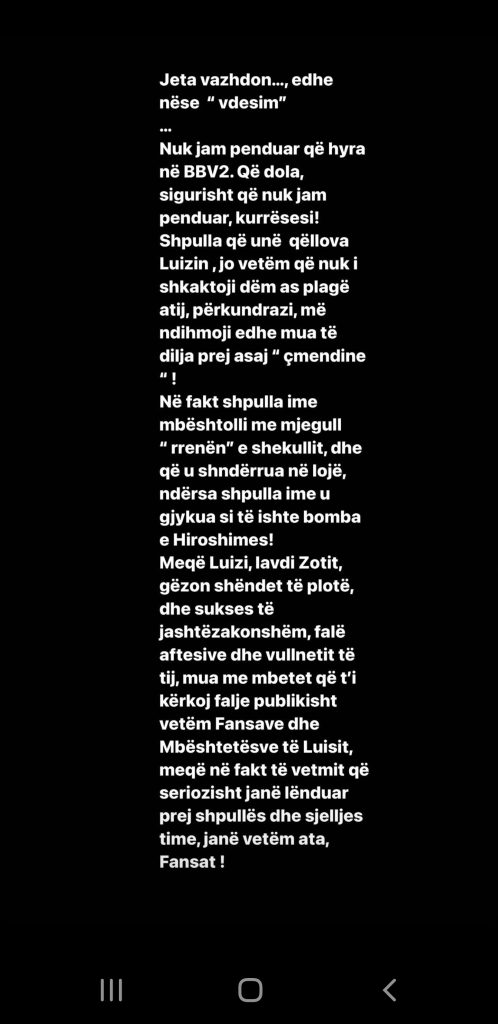 “Jeta vazhdon edhe nese “vdesim” … Nuk jam penduar që hyra në BBV2. Që dola, sigurisht që nuk jam penduar, kurresesi! Shpulla që une qëllova Luizin, jo vetëm qe nuk i shkaktoji dem as plage atij, perkundrazi, me ndihmoji edhe mua te dilja prej asaj ” çmendine “! Në fakt shpulla ime mbeshtolli me mjegull “rrenën” e shekullit, dhe që u shndërrua në loje, ndersa shpulla ime u gjykua si te ishte bomba e Hiroshimes! Meqë Luizi, lavdi Zotit, gezon shendet te plote, dhe sukses te jashtëzakonshëm, fale aftesive dhe vullnetit të tij, mua me mbetet qe t’i kerkoj falje publikisht vetem Fansave dhe Mbeshtetesve te Luisit, meqe ne fakt të vetmit që seriozisht jane lenduar prej shpulles dhe sjelljes time, jane vetëm ata, Fansat!”, ka shkruar ajo.