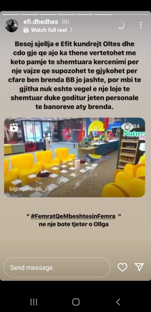 “Besoj se sjellja e Efit kundrejt Oltës dhe çdo gjë që ajo ka thënë vërtetohet me këto pamje të shëmtuara kërcënimi për një vajzë që supozohet të gjykohet për çfarë bën brenda “Big Brother”, jo jashtë, por mbi të gjitha nuk është vegël e një loje të shëmtuar duke goditur jetën personale të banorëve aty brenda”– thuhet në postim.