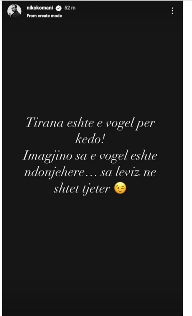 Nëpërmjet një postimi në Instastorye-s ai ka ironizuar aktoren ndërsa shprehet “Tirana është e vogël për këdo! Imagjino sa e vogël është ndonjëherë, … sa lëviz në shtet tjetër.