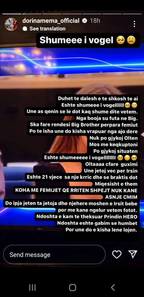 “Shumëëë i vogël! Duhet të dalësh e të shkosh te ai. Është shumë i vogël. Unë as qenin se lë dot kaq ditë vetëm. Nga Booja (qeni) nuk u futa në Big.S’ka fare rëndësi Big Brother përpara fëmiut. Po të isha unë do kisha vrapuar nga ajo derë. Nuk po gjykoj Oltën, mos më keqkuptoni, po gjykoj situatën/ Është shumëëëë i vogëlllllllll. Olta çfarë guximi. Unë jetoj vetëm për Irsin. Është 21-vjeç, sa një krriç dhe se braktis dot.
