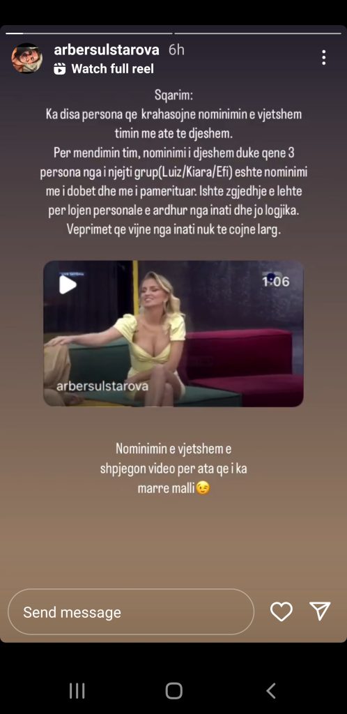 “Sqarim: Ka disa persona që krahasojnë nominimin e vjetshëm timin me atë të djeshëm. Për mendimin tim, nominimi i djeshëm duke qenë 3 persona nga i njëjti grup(Luiz/Kiara/Efi) është nominimi më i dobët dhe më i pamerituar. Ishte zgjedhje e lehtë për lojën personale e ardhur nga inati dhe jo logjika. Veprimet që vijnë nga inati nuk të cojnë larg. Prandaj, kujdes me krahasimet pa vend dhe mos e zhvlerësonj nominimin historik”-shkruan ai në Instastory.