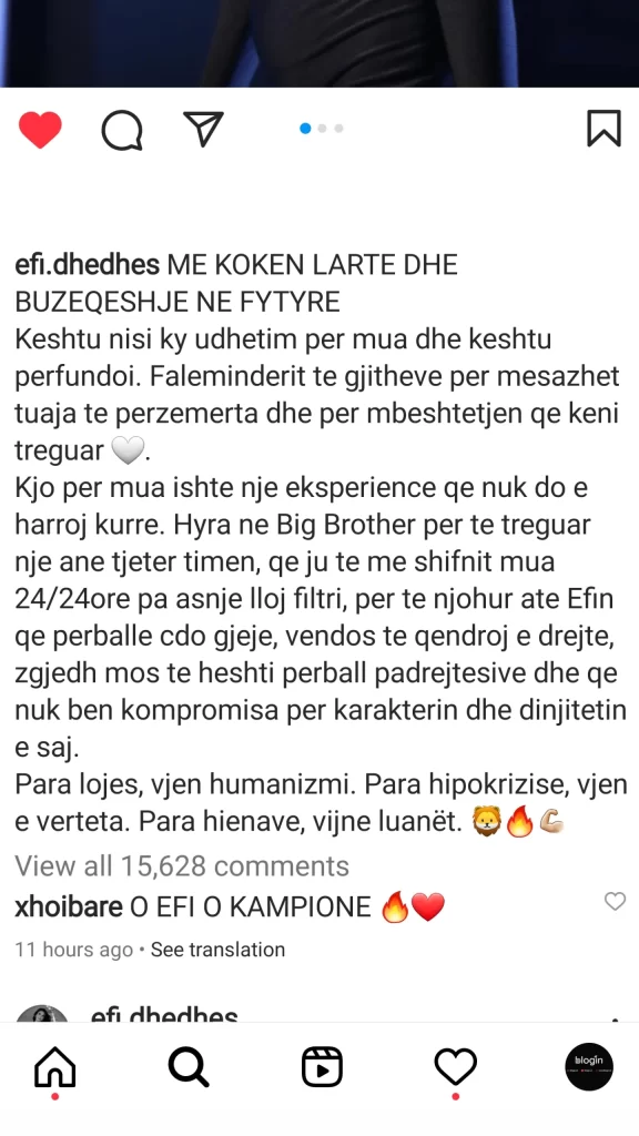 “Me kokën lart dhe buzëqeshje në fytyrë. Kështu nisi ky udhëtim për mua dhe kështu përfundoi. Faleminderit të gjithëve për mesazhet tuaja të përzemërta dhe për mbështetjen që keni treguar. Kjo për mua ishte një eksperiencë që nuk do e harroj kurrë. Hyra në Big Brother për të treguar një anë tjetër timen, që ju të me shihnit mua 24/24 orë pa asnjë lloj filtri, për të njohur atë Efin që përballë çdo gjëje, vendos të qëndroj e drejtë, zgjedh mos të heshti përballë padrejtësive dhe që nuk bën kompromise për karakterin dhe dinjitetin e saj. Para lojës, vjen humanizmi. Para hipokrizisë, vjen e vërteta. Para hienave, vijnë luanët”, ka shkruar Efi në Instagram.