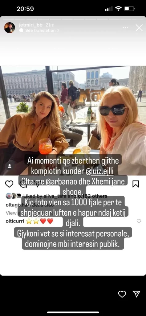 Ish-fituesi i Big Brother Albania 3, Jetmir Salaj, ka publikuar një foto ku thotë se Olta është shoqe me Xhemi Shehu dhe kjo e fundit me Arbana Osmanin. “Gjykoni vet sa interesat personale dominojnë mbi interesin publik”, ka shkruar ndër të tjera ai.