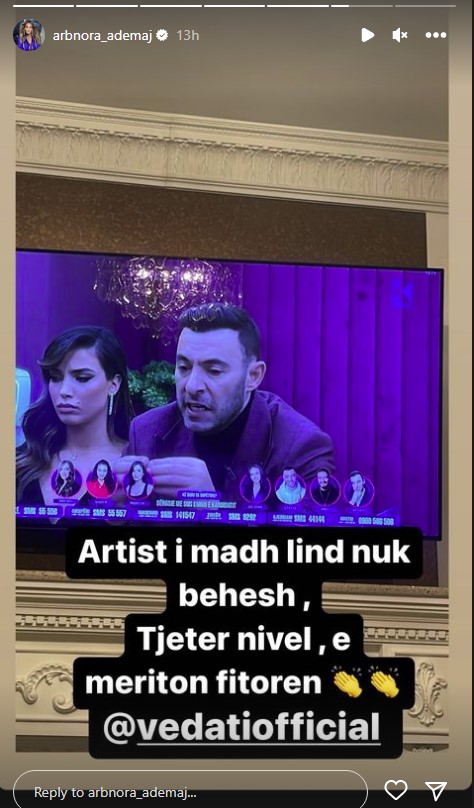 Modelja ka treguar publikisht se është mbështetëse e Bajramit që sipas saj e meriton edhe fitoren. ”Artist lind nuk bëhesh, tjetër nivel, e meriton fitoren”, ka shkruar ajo duke e etiketuar banorin e shtëpisë së famshme.