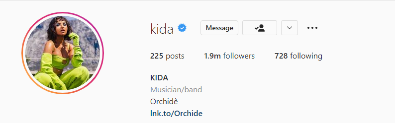Kësaj liste të artistëve më të ndjekur, i bashkohet edhe këngëtarja Kida, e cila kohëve të fundit është mjaft aktive në projekte muzikore dhe në rrjete sociale. Së fundmi, ajo ka paralajmëruar një bashkëpunim me Ledri Vulën pas suksesit që kishte kënga e kaluar në bashkëpunim me këtë të fundit dhe Butrint Imerin. Kida njësoi si artistët e tjerë ka arritur të rris numrin e ndjekëseve kështu tani duke numëruar mbi 1.8 milionë ndjekës në “Instagram”.