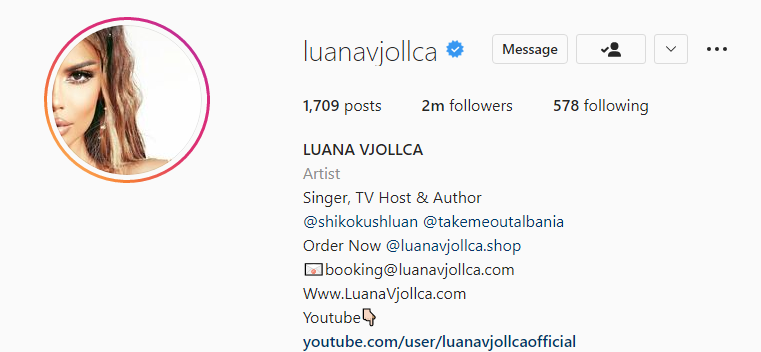 Këngëtarja Luana Vjollca, njëherësh edhe moderatore është artistja e tretë më e ndjekur në këtë rrjet social, e që vazhdimisht publikon fotografi duke i mbajtur aktiv ndjekësit e saj. Luana po ashtu si vitin e kaluar numëron mbi 2 milion ndjekës në rrjetin social “Instagram”.