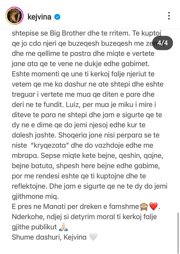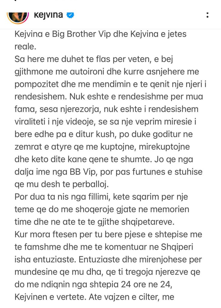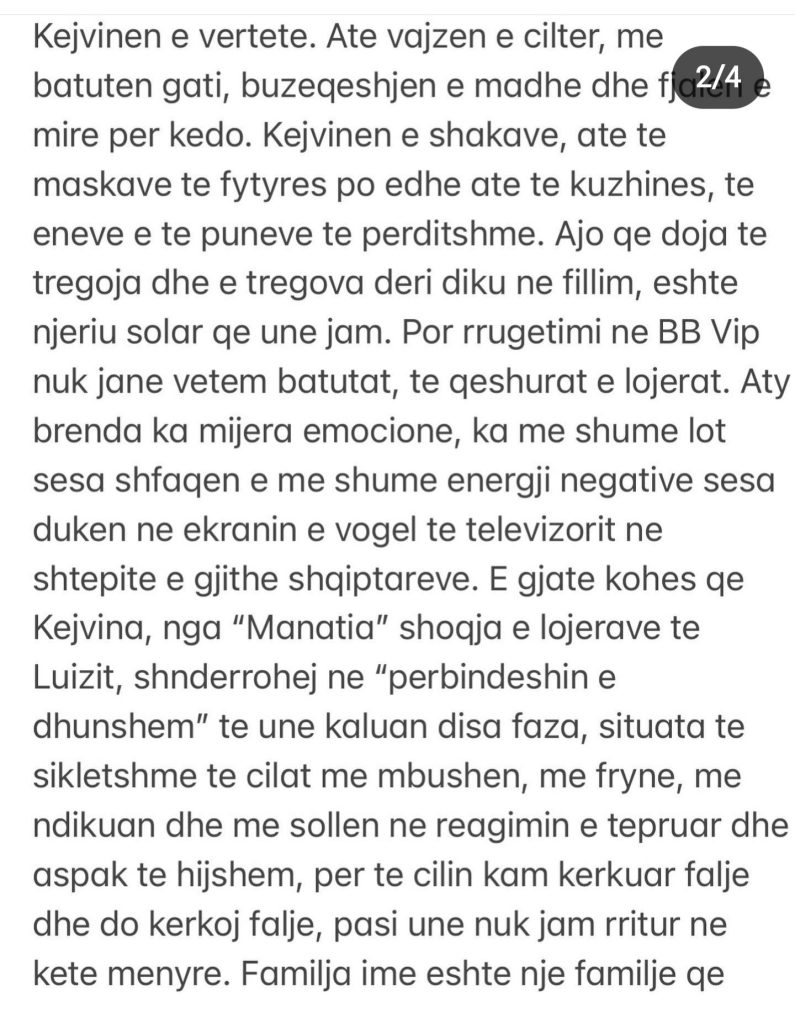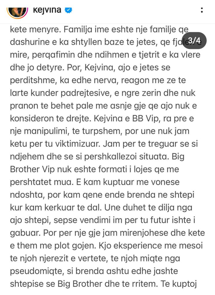 “Kejvina e BB Vip, ra pre e një manipulimi, të turpshëm, por unë nuk jam këtu për t’u viktimizuar. Jam për të treguar se si ndjehem dhe se si përshkallëzoi situata. Big Brother Vip nuk është formati i lojës që më përshtatet mua. E kam kuptuar me vonesë ndoshta, por kam qenë ende brenda në shtëpi kur kam kërkuar të dal. Unë duhet të dilja nga ajo shtëpi, sepse vendimi im për tu futur ishte i gabuar. Por për një gjë jam mirënjohëse dhe këtë e them me plot gojën. Kjo eksperiencë më mësoi të njoh njerëzit e vërtetë, të njoh miqtë nga pseudomiqtë, si brenda ashtu edhe jashtë shtëpisë së Big Brother dhe të rritem”– shkruan fillimisht modelja.