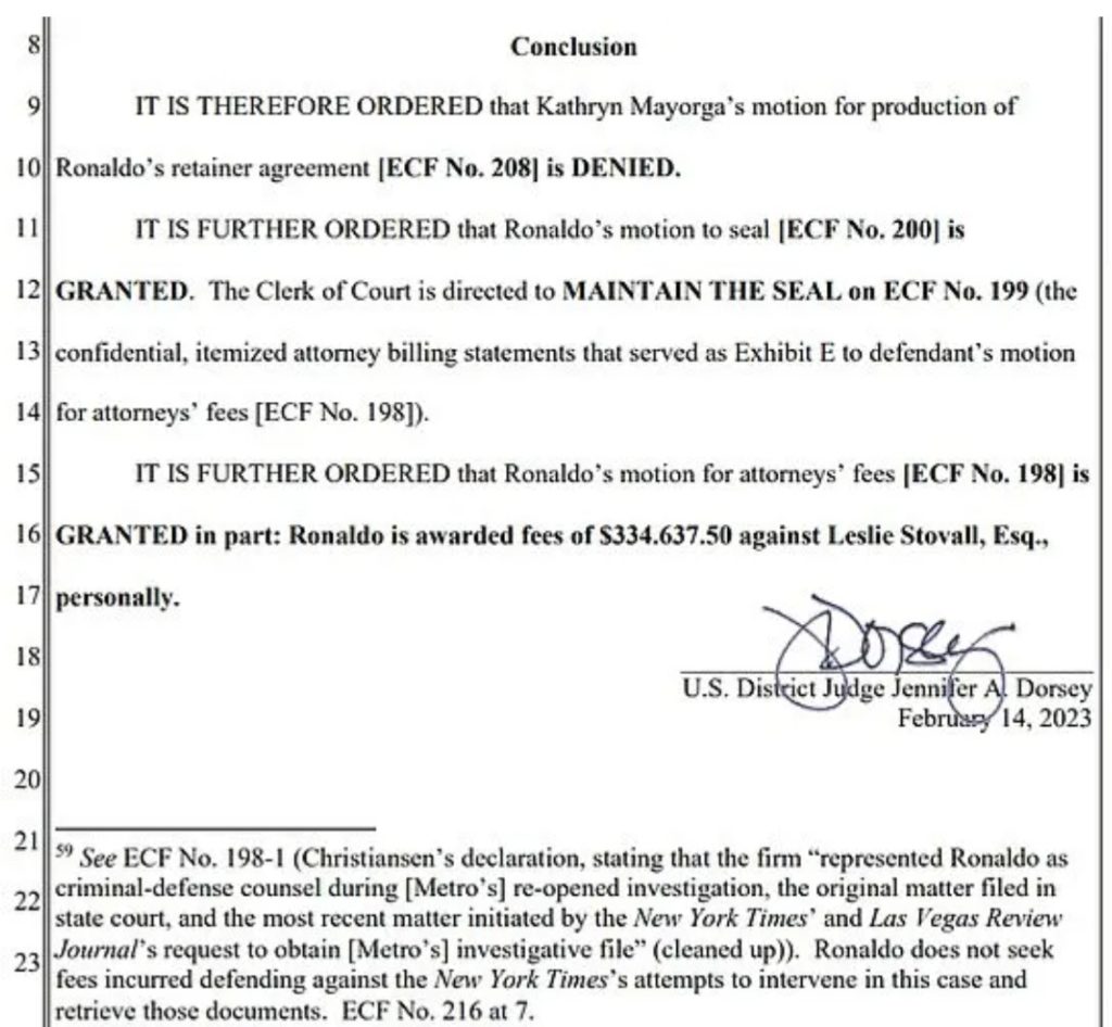 Gjyqtarja tha se ajo nuk mund të urdhëronte avokatin e turpëruar t’i dorëzonte Ronaldos shumën e plotë që ai pretendonte, sepse ai mund të kishte vepruar më shpejt për të pushuar çështjen kundër tij.