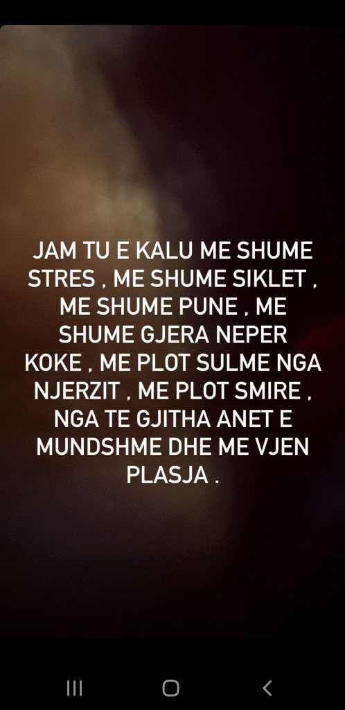 Me shumë dashuri me shumë lule me shumë fjalë të bukura me shumë mirëkuptim me shumë mbështetje por jo. Jam tu e kalu me shumë stres me shumë siklet me shumë punë me shumë gjëra nëpër kokë, me plot sulme nga njerëzit me plot smirë ngatë gjitha anët e mundshme dhe më vjen plasja. ajo shtoj se ”nuk po mund t’i shijojë as goditjet e bebit”, duke punuar fortë.