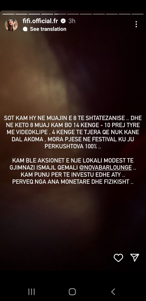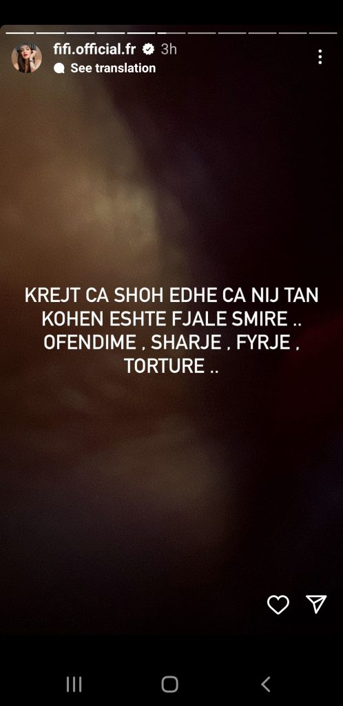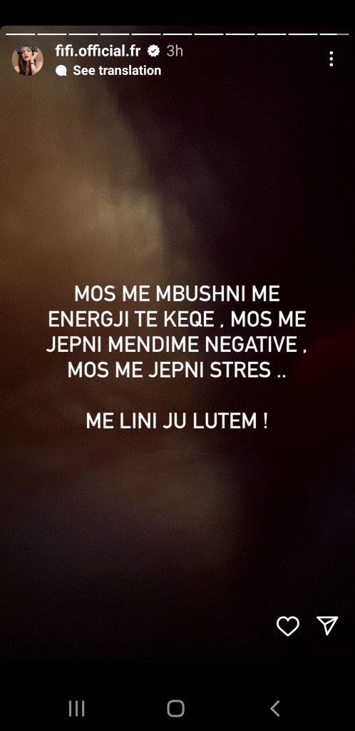 Përmes disa shkrimeve në InstaStory këngëtarja zbuloi se nga puna e vazhdueshme dhe nga mesazhet e njerëzve po kalon një periudhë me stres, siklet dhe smirë. Më poshtë Fifi shkruan: Kam mendu se shtatzaninë do e kaloja krejt ndryshe.
