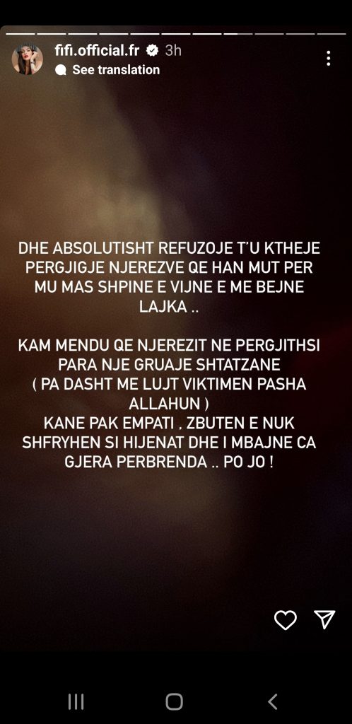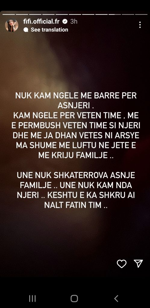 Unë nuk shkatërrova asnjë familje, unë nuk kam nda asnjeri. Kështu e ka shkru ai nalt fatin tim. Unë thjedht du me e bo një festë për bebin tim me gëzu që po e sjell në jetë. më lini pash të madhin zot. Mos më mbushni me energji të keqe, mos më jepni energji negative mos më jepni stres ju lutem- përfundoi Fifi.