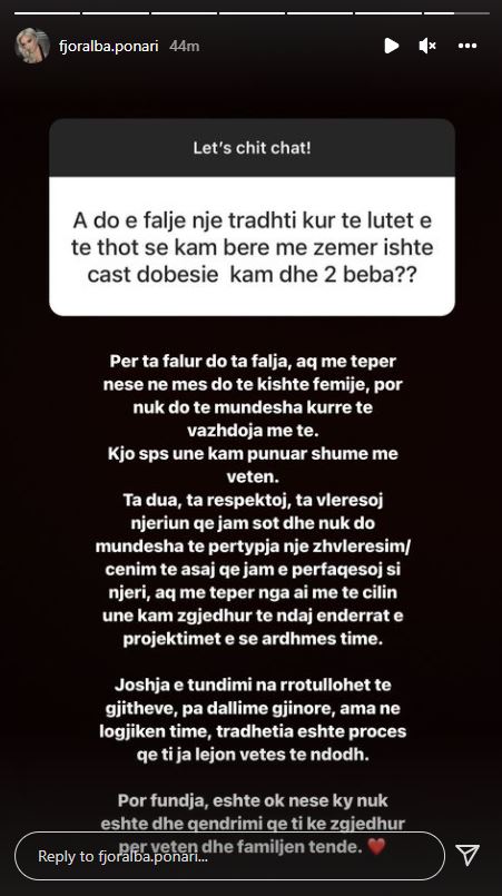 Një ndjekës e pyeti Fjoralbën nëse do të falte tradhtinë dhe përgjigja e saj habiti jo pak, pasi ajo shkroi se sipas saj joshja e tundimi na rrotullohet të gjithëve,dhe se falte partnerin, por nuk do të vazhdonte më krah tij.