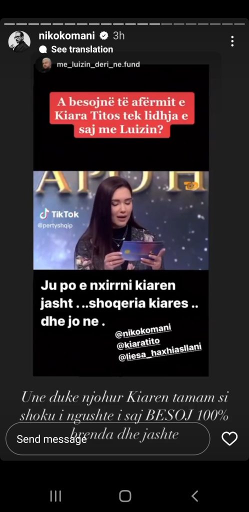 Ndërsa miku i ngushtë i Kiarës, Niko Komani ka treguar se beson 100% si brenda ashtu edhe jashtë për këtë lidhje. Duke përgënjeshtruar fjalët e gazetarit.