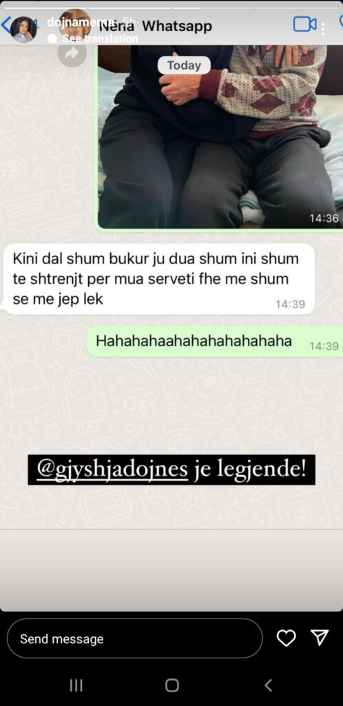 Me një screenshot bisede në ‘Whatsapp’, Dojna tregoi një koment të gjyshes së saj pasi moderatorja i dërgoi një foto ku pozonte me gjyshin. “Keni dalë shumë bukur, ju dua shumë! Jeni shumë të shtrenjtë, por për mua Serveti(bashkëshorti i saj) edhe më shumë sepse më jep lekë”- i përgjigjej ajo.