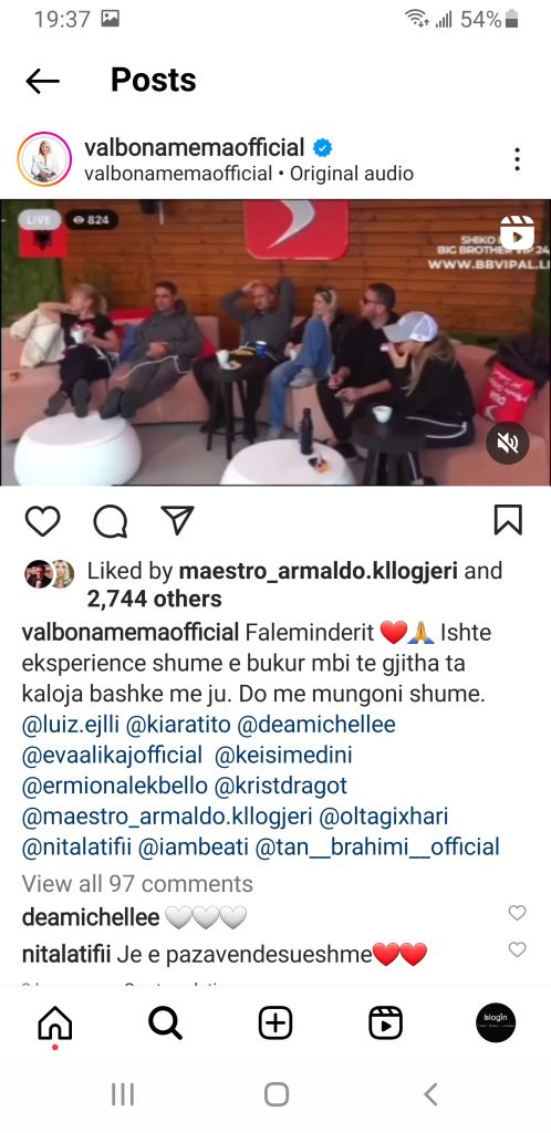 “Fatkeqesisht rrugetimi im perfundoi ktu. Familja eshte me e rendesishme se nje loje. Motra ime ka nevoje per mua pasi eshte e shtruar ne spital ne gjendje te rende shendetesore. Me ngelet te them nga zemra faleminderit per te gjithe suportin qe m’keni dhene. Ishte eksperienca me e bukur e jetes sime. Fitofte me i miri. Mirenjohje pa mase ju dhe @bigbrotheralb_vip”