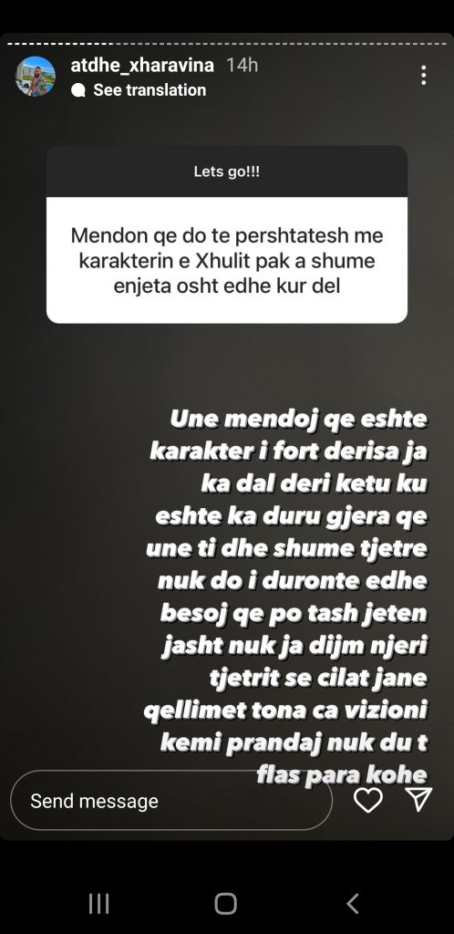 Unë mendoj që është karakter i fortë përderisa ja ka dalë deri këtu ku është, ka duruar gjëra që unë, ti dhe shuë të tjerë nuk do i duronin edhe besoj që po. Tani jetën jashtë nuk ia dimë njëri-tjetrit se cilat janë qëllimet tona, çfarë vizioni kemi, prandaj nuk dua të flas para kohe.