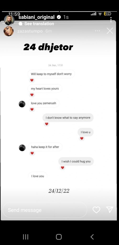 Sabiani ka dalë hapur kundër lidhjes së të bijës duke thënë se Kristi po gënjën. Madje Sabiani ka posuara bisedat e Kristit me Zazën, të dashurën e tij jashtë shtëpisë e cila ka publikuar vetë këto mesazhe. Mesazhet konsistojnë të datës 24 dhjetor, ditës së parë të Big Brother VIP.