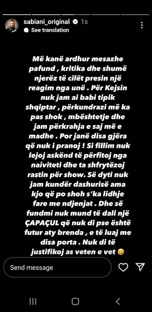 “Me kane ardhur mesazhe pafund, kritika dhe shume njerez te cilet presin një reagim nga unë. Për Kejsin nuk jam ai babi tipik shqiptar, perkundrazi me ka pas shok, mbështetje dhe jam përkrahja e saj me e madhe. Por jane disa gjëra që nuk i pranoj! Si fillim nuk lejoj askënd te perfitoj nga naiviteti dhe ta shfrytëzoj rastin per shoë. Se dyti nuk jam kunder dashurise ama kjo që po shoh s’ka lidhje fare me ndjenjat . Dhe se fundmi nuk mund te dali nje ÇAPAÇUL që nuk di pse është futur aty brenda, e te luaj me disa porta. Nuk di të justifikoj as veten e vet”, shkruan më tej Sabiani