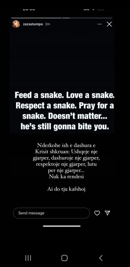 Në bisedën e zhvilluar në rrjetet sociale në 24 dhjetor të vitit të kaluar, duket se çifti i shpreh ndjenjat njëri-tjetrit me fjalë dashurie, ndërsa në një postim tjetër ajo e konsideron Kristin një “gjarpër” që sado ta ushqesh dhe të kujdesesh, në fund do të të kafshojë.