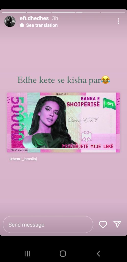 Loja e saj brenda shtëpisë është pëlqyer shumë duke fituar zemrën e ndjekësve të cilët së fundmi kanë bërë një editim shumë ‘funny’ duke vendosur fytyrën e Efit në ‘letrën e lekut’.