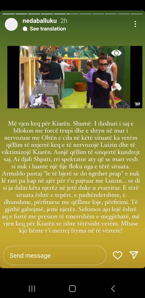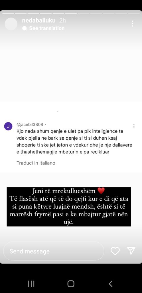 Bazuar në këtë reagim të saj,një përdorues i rrjeteve sociale ka bërë një koment aspak të këndshëm”, të cilin Neda ka zgjedhur ta ndajë me të gjithë ndjekësit e saj në Instagram.