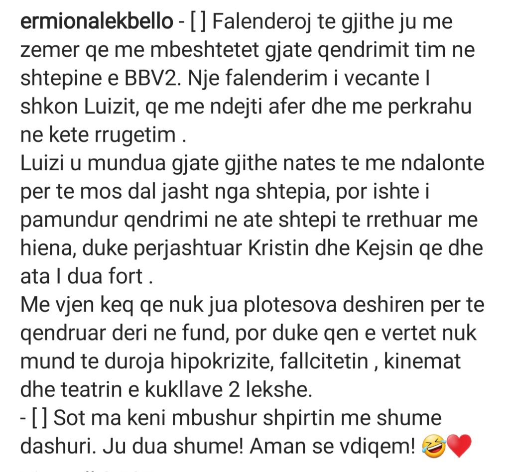 “Falenderoj te gjithe ju me zemer qe me mbeshtetet gjate qendrimit tim ne shtepine e BBV2. Nje falenderim i vecante I shkon Luizit, qe me ndejti afer dhe me perkrahu ne kete rrugetim .