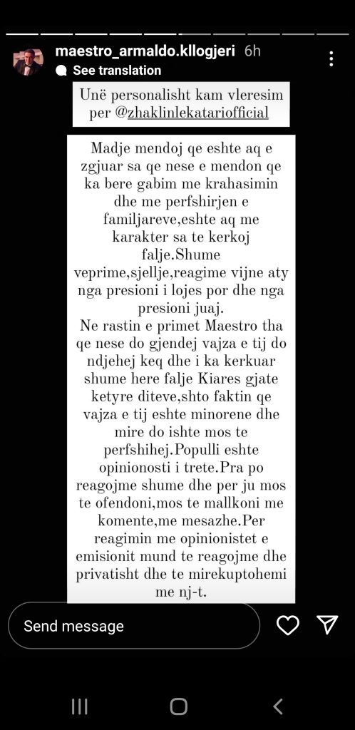 Në një status ajo shkruan se e respekton Zhaklinën dhe nëse ajo e mendon se ka thënë diçka gabim, ka aq karakter sa të kërkojë falje.