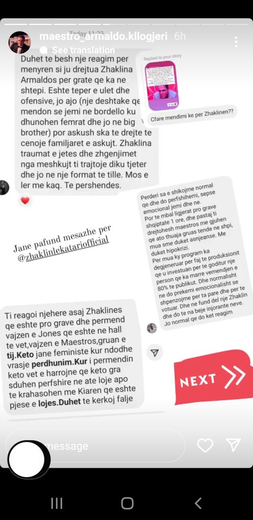 Gjatë një diskutimi të ndodhur spektaklin e shkuar në “Big Brother VIP” mes Armaldos dhe Zhaklinës, kjo e fundit iu drejtua tenorit me fjalët “Foli grave që ke në shtëpi kështu”.