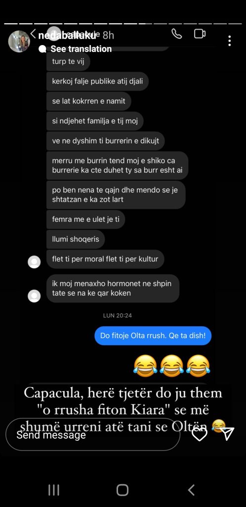 Dhe këtyre dyshimeve, duket se i ka vënë vulën opinionistja e “Për’puthen”, Neda Balluku. Në nje bisedë të publikuar nga një fans i një konkurrenti të programit të dashurisë me të cilin neda pati dhe një debat ajo është shprehur e bindur sr këtë “BBV” do ta fitojë Olta.