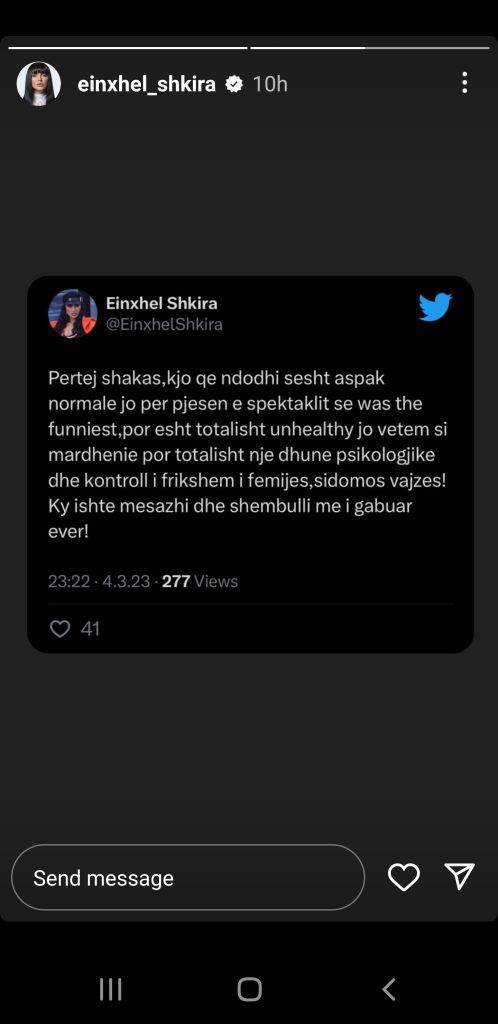 Një reagim përmes rrjetit sociale Instagram e pati edhe ish-banorja Einxhel Shkira,