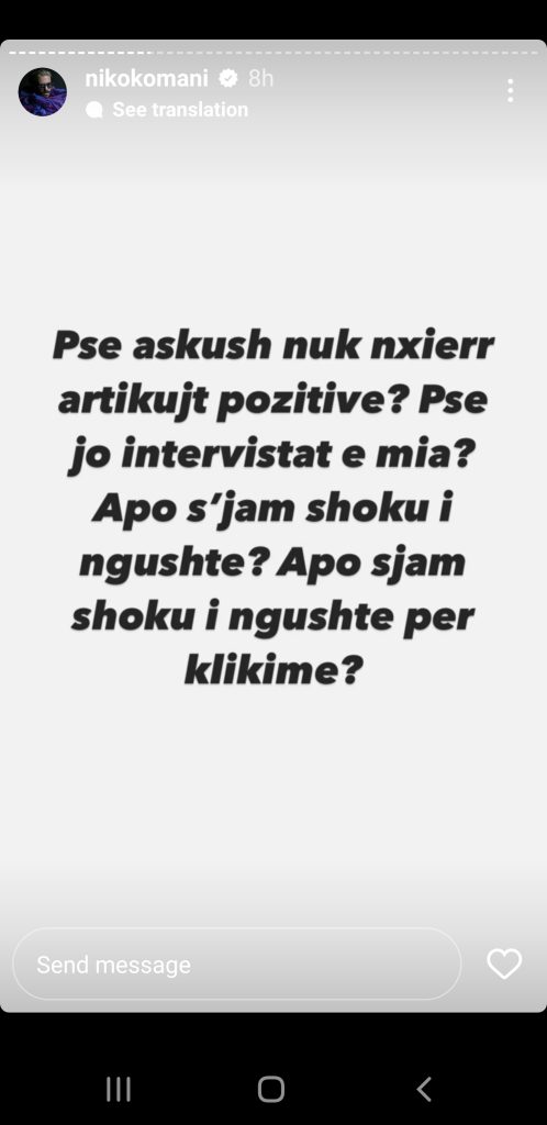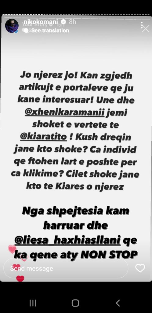 Nisur nga kjo situatë kanë reaguar të revoltuar miqtë e moderatores. Sipas tyre, Kiarës i është përcjellë informacion i cënguar dhe vetëm negativ. “Jo njerëz jo, kanë zgjedhur artikujt e portaleve që ju kanë interesuar. Unë dhe Xheni Karamani, Liesa Haxhiasllani jemi shokët e vërtetë të Kiarës. Kush dreqin janë këto shokë? Ca individë që ftohen lart e poshtë për ca klikime? Cilët shokë janë këto të Kiarës o njerëz? Pse askush nuk nxjerr artikujt pozitivë? Pse jo intervistat e mia? Apo s’jam shoku i ngushtë? Apo s’jam shoku i ngushtë për klikime?”, ka shkruar Niko Komani.