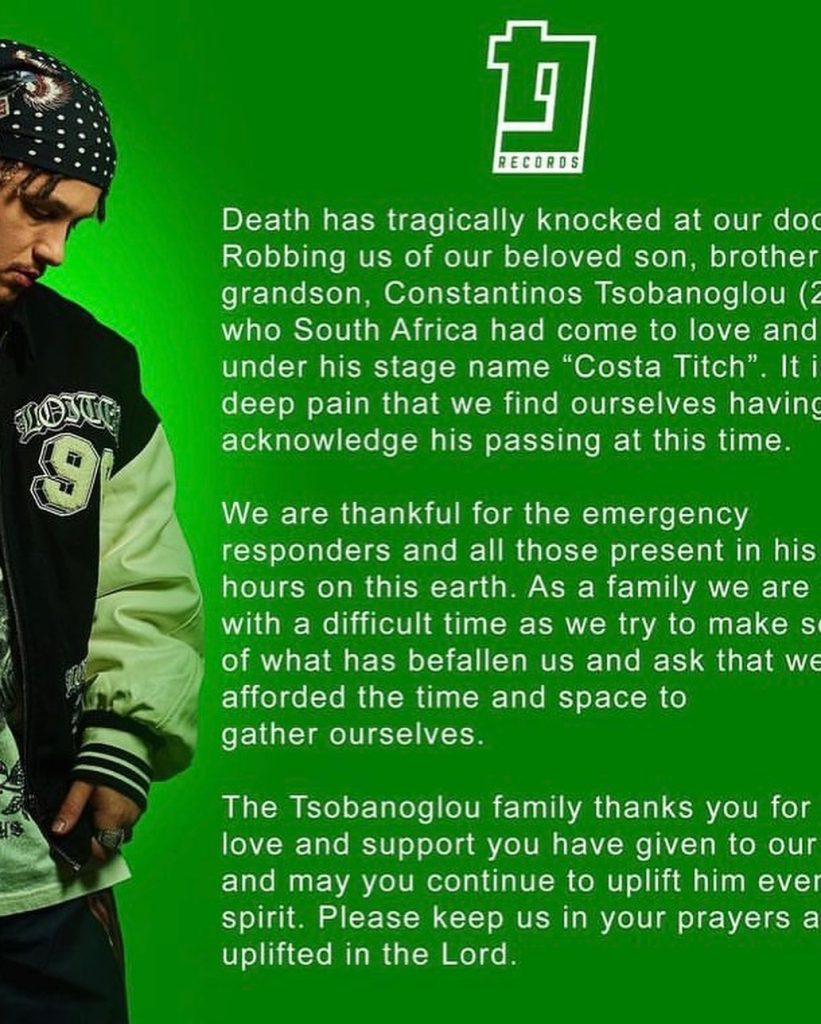 “Vdekja na trokiti tragjikisht në derën tonë, duke na grabitur djalin, vëllain dhe nipin tonë të dashur, Constantinos Tsobanoglou, të cilin Afrika e Jugut e kishte dashuruar dhe adhuruar me emrin e tij artistik “Costa Titch”, thanë ata.