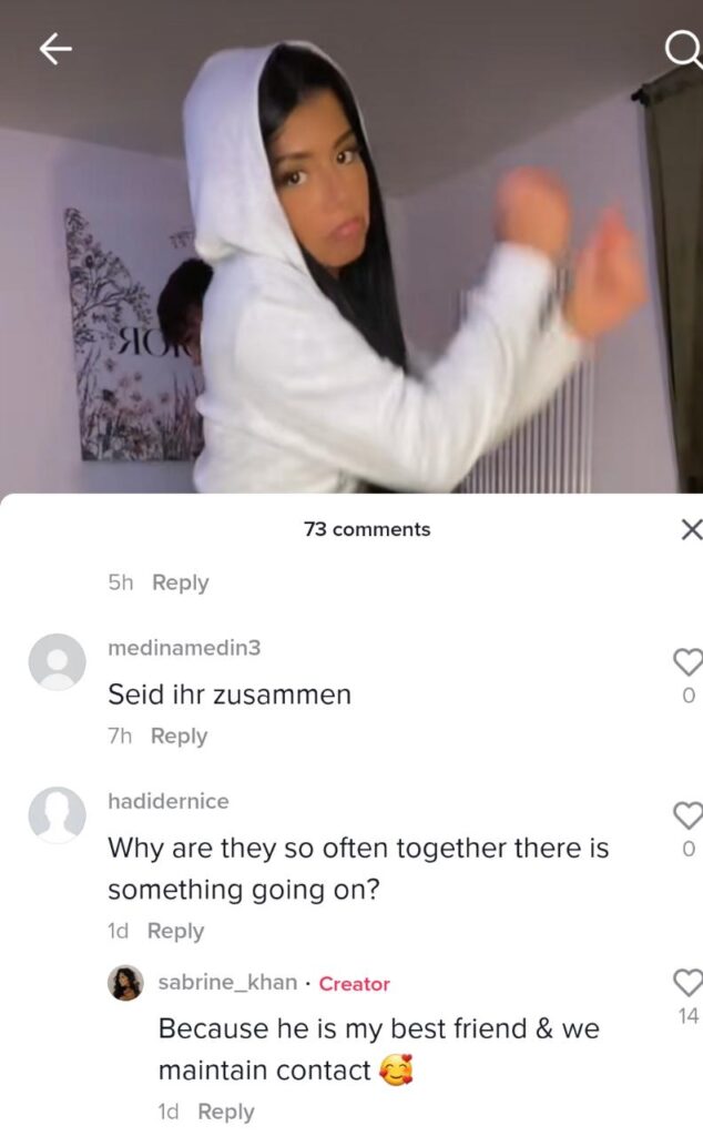 Megjithatë, interesant është fakti se protagonistët e mohojnë se janë në lidhje. Një komentues pyeti në një video në TikTok: “Pse janë ata kaq shpesh së bashku? Ka diçka këtu…” ky koment ka marrë vëmendjen e Sabrine e cila i ka kthyer një përgjigje duke shkruar se janë thjesht shokë të ngushtë. “Sepse ai është shoku im i ngushtë dhe ne jemi në kontakt”