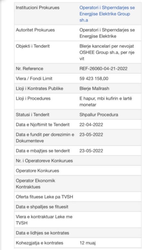 Në sasinë e mallit që do të përfshihet në tenderin me vlerë marramendëse, bëjnë pjesë materiale të cilat me çmim shumice për një vit do të kushtonin më pak se 1/3 e çmimit të vendosur nga dora e kripur e OSHEE.
