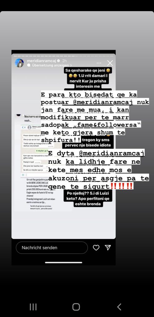 Anaid Kaloti ka publikuar një bisedë private me “Genën” e cila menaxhonte deri më sot, Instagramin e Luizit. Ajo tregon se prej kohësh ka qënë në presion nga Top Channel dhe Meridian Ramçaj.