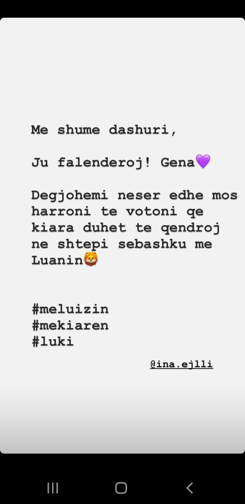 “Unë nuk flas gënjeshtra pas shpine, ty të ka bërë leckë dhe Luizi nga brenda shpisë por ti nuk ndalesh, i prishi 200.000 kontrate me Golden Eagle sepse do fuste b-52 ne top channel. Prandaj instagrami Luizit sot mban emrin e motres së tij. Tani dil e thuaji njerzve ca të kanë mësuar te zyra… përça dhe sundo!”- shkruan Anaidi.