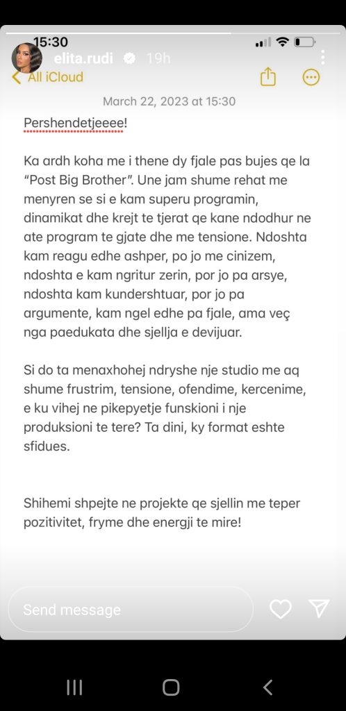 “Përshëndetje, ka ardhur koha me i thënë dy fjalë pas bujës që la “Post Big Brother”. Unë jam shumë rehat me mënyrën sesi e ka superuar programin, dinamikat dhe gjithë të tjerat që kanë ndodhur në atë program të gjatë dhe me tension. Ndoshta kam reaguar edhe ashpër, por jo me cinizëm, ndoshta e kam ngritur zërin, por jo pa arsye, ndoshta kam kundërshtuar, por jo pa argument, kam ngel edhe pa fjalë, ama veç nga paedukata dhe sjellja e devijuar. Si do ta menaxhoja ndryshe një studio me shumë frustrim, tensione, ofendime, kërcënime, ku vihej në pikëpyetje funksioni i një produksioni të tërë? Ta dini, ky format është sfidues. Shihemi shpejtë në projekte që sjellin më tepër pozitivitet, frymë dhe energji të mirë”, ka shkruar Elita.