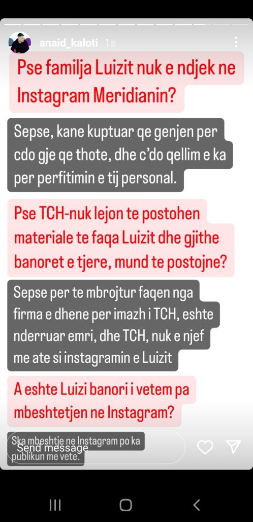 Po ashtu, në statusin e tij ai hedh akuza ndaj Meridian Ramçajt për të cilin thotë se do hidhet në gjyq nga Jurgena, shoqja e Luizit që menaxhon Instagramin e tij pasi e ka kërcënuar. Anaidi shton se familja e Luizit nuk e ndjek Meridianin në Instagram sepse gënjen dhe po bën çdo gjë për përfitime personale.