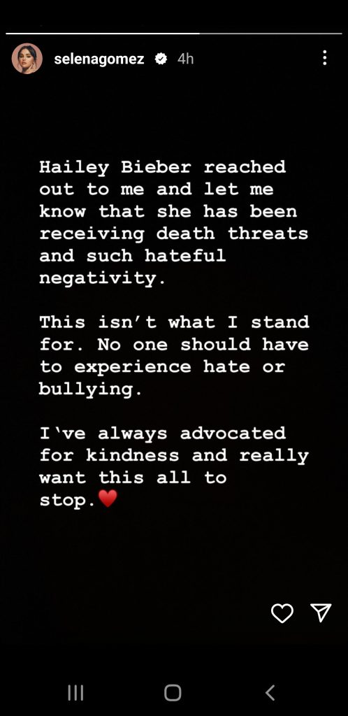 Aktorja ka postuar një mesazh në Instagram Story duke zbuluar se Hailey e ka kontaktuar. Gjatë diskutimit të tyre privat, Hailey tregoi se njerëzit kishin kërcënuar jetën e saj mes akuzave të bëra nga përdoruesit e TikTok që pretendonin se Hailey është një “vajzë e keqe” që nuk e ka trajtuar gjithmonë Selenën me mirësi.