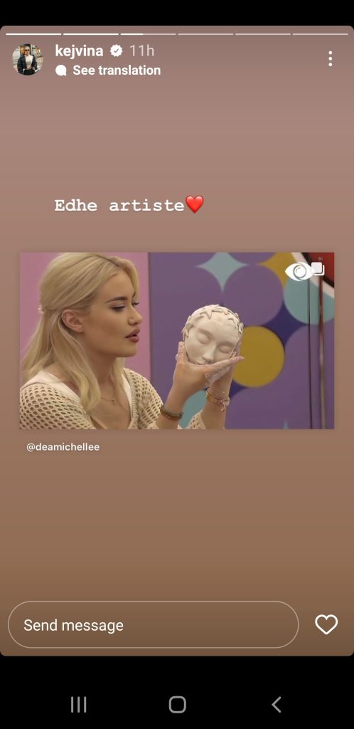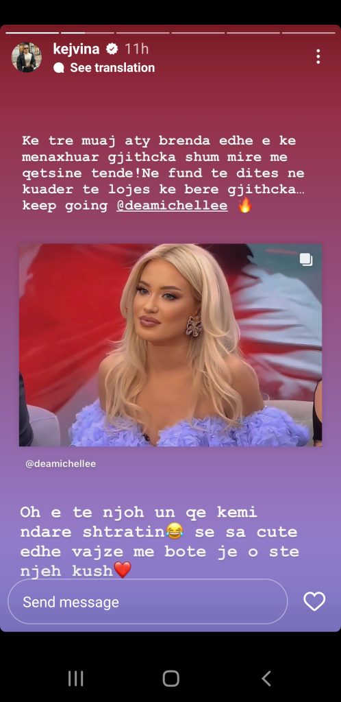 Sakaq, Kejvina i ka dalë në krah Deas. Pa përmendur Efin, apo ndonjë banor tjetër, Kejvina shkruan se Dea meriton finalen, se është treguar qetësi. “Ke tre muaj aty brenda dhe e ke menaxhuar gjithçka shumë mirë me qetësinë tënde. Në fund të ditës në kuadër të lojës ke bërë gjithçka. Vazhdo kështu. O të njoh unë që kemi ndarë shtratin se sa cute dhe vajzë me botë je o s’të njeh kush!”- shkruan Kejvina.