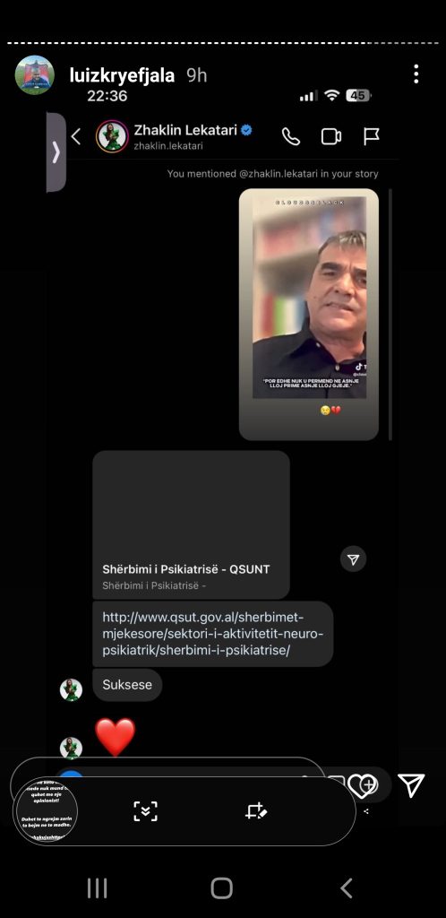 Mirëpo në rrjetet sociale po qarkullon një foto ku në qendër të kritikave është opinionistja Zhaklina Lekatari dhe videon që fansat i kanë dërguar në Instagram me qëndrimin e babait të Kiarës. Ajo i është përgjigjur me linkun e QSUNT, përkatësisht për shërbimin e psikiatrisë dhe krahas saj shkruan ‘Suksese”.