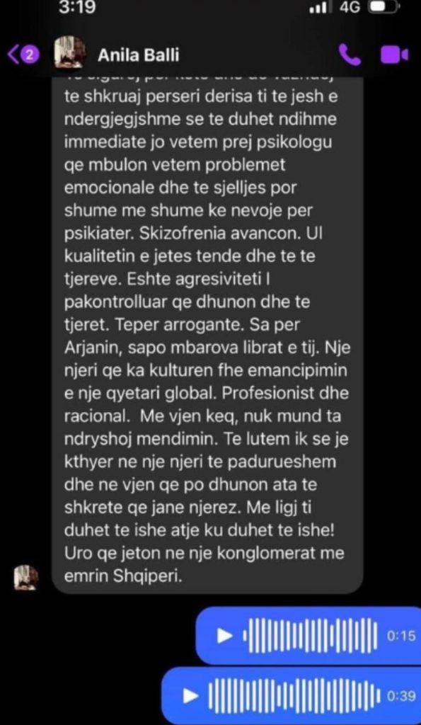 Zhaklin Lekatarit, opinionistes së “BBVA”, i janë publikuar disa audio ku dëgjohet të kërcënojë një psikologe shqiptare, Anila Balla e cila jeton dhe ushtron profesionin e saj në SHBA.
