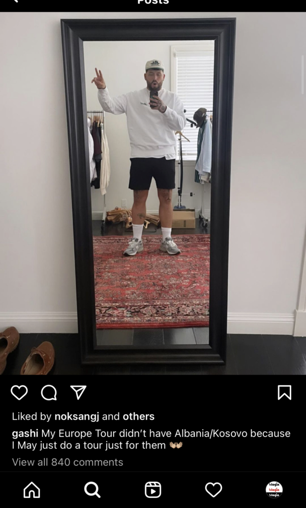 Ndonëse ka vite që është larguar dhe ka arritur goxha famë në SHBA, ai nuk e ka harruar origjinën e tij dhe këtë na e ka treguar shpesh, sidomos në rrjetet sociale. Artisti shpesh ndan me ndjekësit elemente të kulturës shqiptare, madje edhe ato anë jo shumë të bukura.