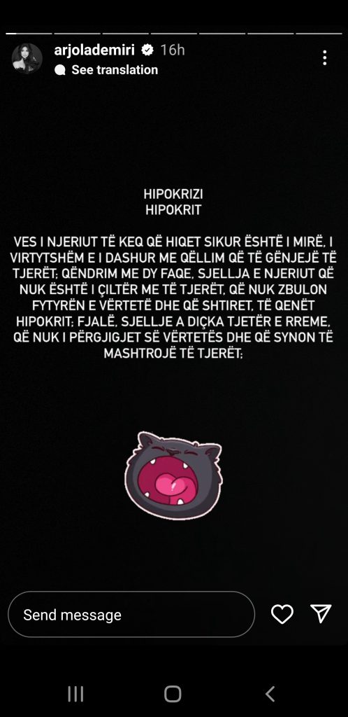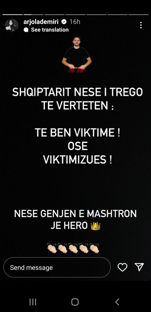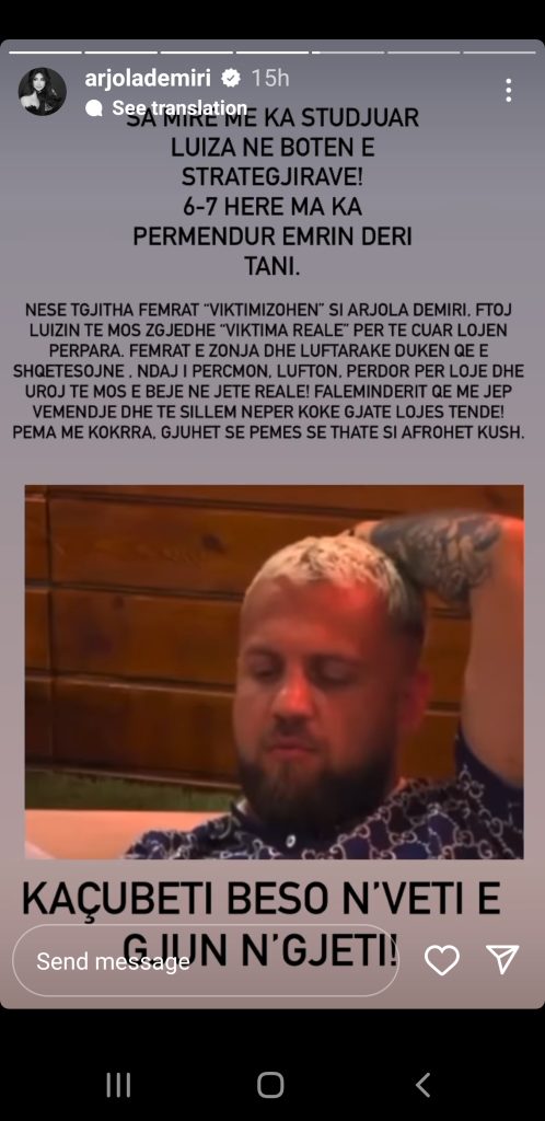 “Sa mirë më ka studiuar Luiza në botën e strategjive. 6-7 herë më ka përmendur emrin deri tani. Nëse të gjitha femrat viktimizohen si Arjola Demiri. Ftoj Luizin të mos zgjedhë viktima reale për të çuar lojën përpara.
